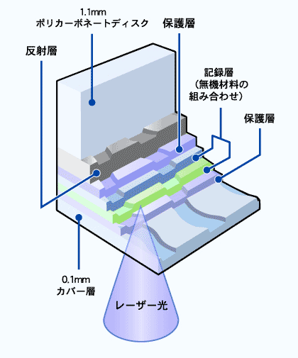 ブルーレイ(BD-R)が劣化することを踏まえ、まずは(BD-R)はどんな構造になっていて映像データを記録しているのかをご紹介させて頂きます。 BD-R(Blu-ray Disc Recordable)の記録層はシリコンと銅、二酸化テルルとパラジウムなどを組合せた無機材料の組み合わせ無機皮膜を作り記録層としています。記録層はグルーブという溝と、溝の壁が左右に蛇行するウォブルによって書き込み位置を案内するしくみになっています。 記録層を保護する保護層(ポリカーボネートト樹脂)はCDが1.1mm、DVDが0.6mm、Blu-rayは、保護層は0.1mmと極薄になっておりますが非常に強固なハードコート処理が施されています。