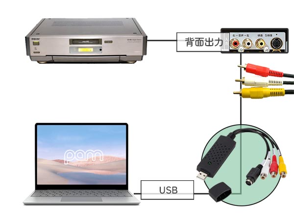 Hi8のビデオデッキの背面の出力端子に赤白黄の端子(オス⇔オス)を挿し、ビデオキャプチャーの赤白黄(メス)に挿し込み、PCとつなぎます。 ※ビデオキャプチャーのほかに赤白黄(オス⇔オス)のケーブルが別途必要となります。