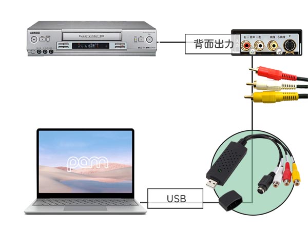 VHS-C(VHS)のビデオデッキの背面の出力端子に赤白黄の端子(オス⇔オス)を挿し、ビデオキャプチャーの赤白黄(メス)に挿し込み、PCとつなぎます。 ※ビデオキャプチャーのほかに赤白黄(オス⇔オス)のケーブルが別途必要となります。
